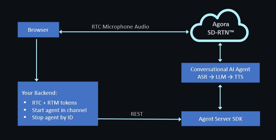 POST /api/token: Issues RTC + RTM tokens for a given channel and UIDPOST /api/invite-agent: Starts the agent using the Agent Server SDKPOST /api/stop-conversation: Stops the agent by ID