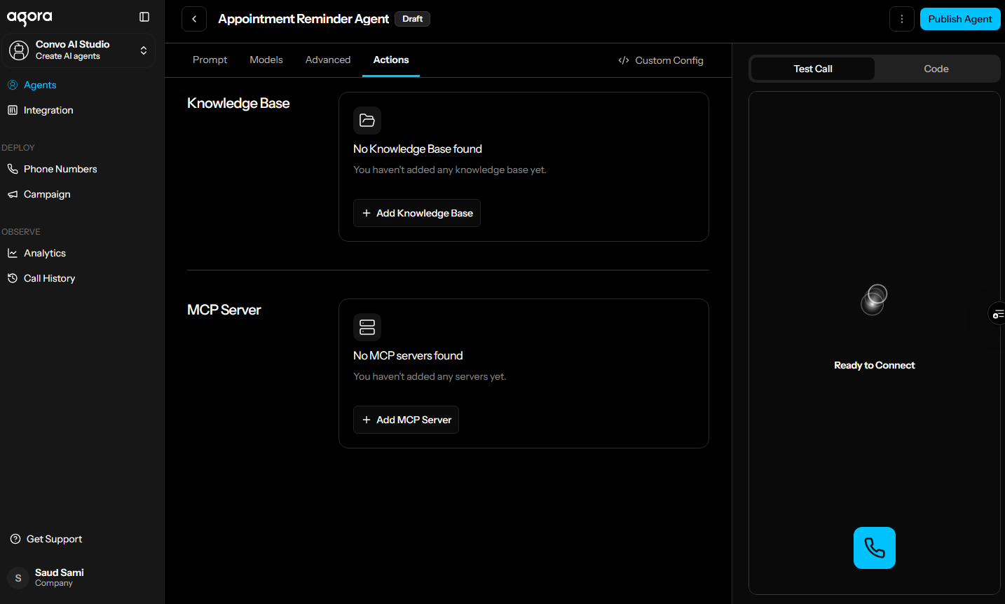 The Actions tab is where you connect your agent to external data and services.