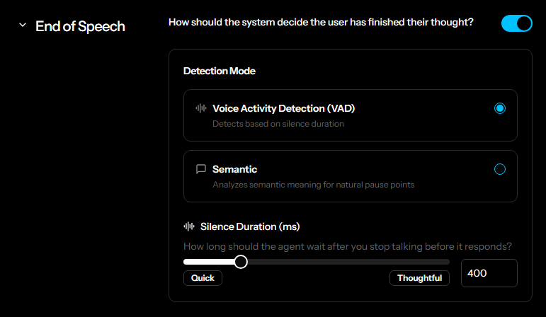 - Semantic: Analyzes the semantic meaning of speech to identify natural pause points. Recommended for more natural conversations.