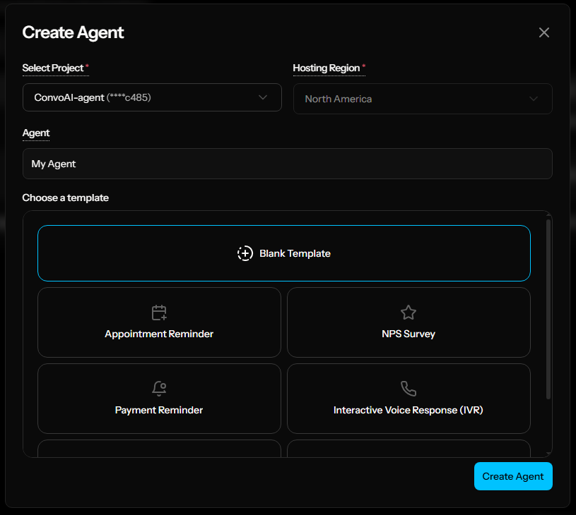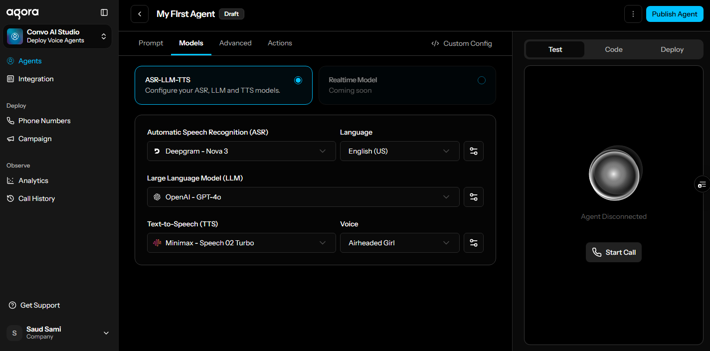 Select an Agora project from the dropdown. The agent uses this project's credentials to connect to Agora, and usage is billed to this project.